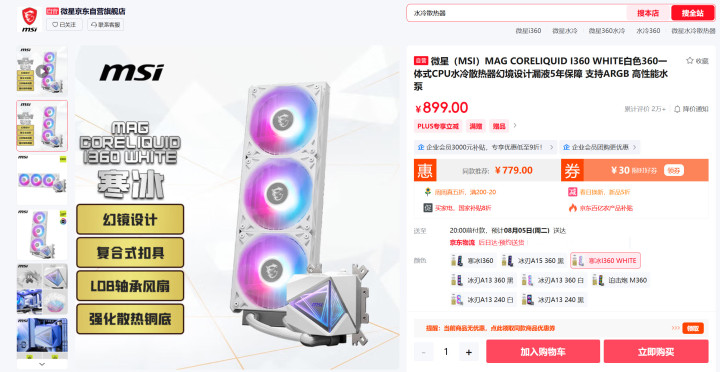 价格与质保:京东自营价899元,白色版比黑色版贵30元。微星为这款水冷提供五年漏液保障服务,让用户使用更加安心。