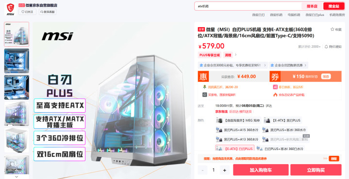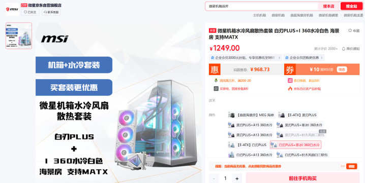 全家桶套装:如果预算充足,建议直接购买微星的全家桶套装,包括白刃PLUS机箱、A1000GS电源和I360 White水冷。套装价格约为2100元(2025年8月数据),相比单独购买具有更高的性价比。同时,套装中的产品能够更好地协同工作,减少兼容性问题。