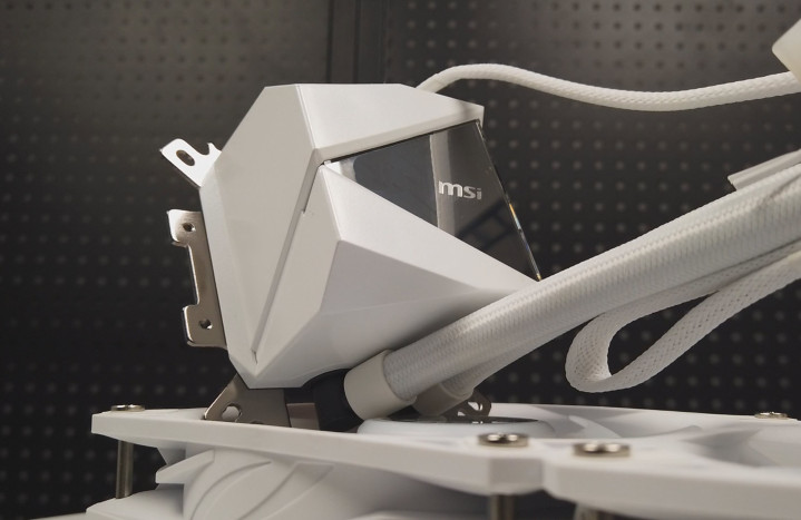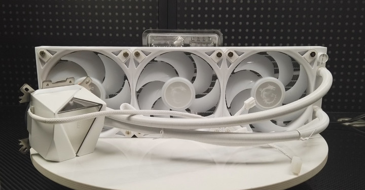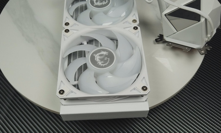 外观设计:I360 White采用全白色设计,冷排和风扇均为纯白色,与白色主题装机完美搭配。冷排尺寸为394×119×27mm,内置12条加宽水道,FPI达到20,水流量较传统设计提升25%。冷头采用独特的双面无限镜设计,顶部搭载一块支持ARGB灯效控制的双面无限镜,中间有MSI LOGO点缀,从不同角度观看都能呈现出绚丽的光影效果。